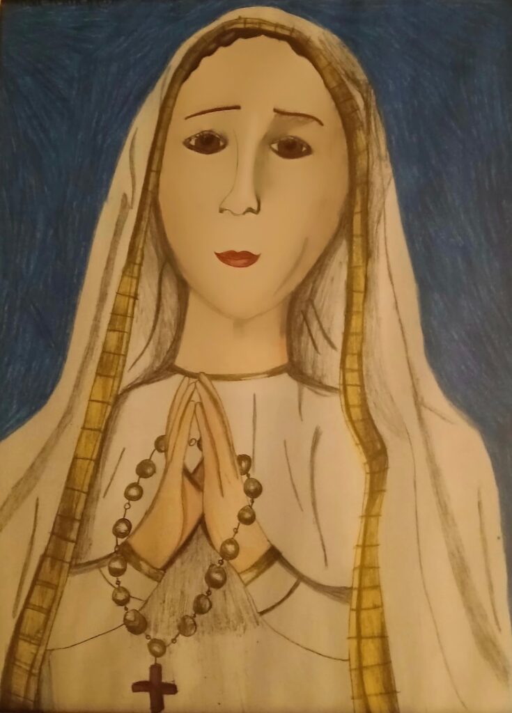 The Blessed Mother holding a rosary. Original artwork by Amanda Fennell.