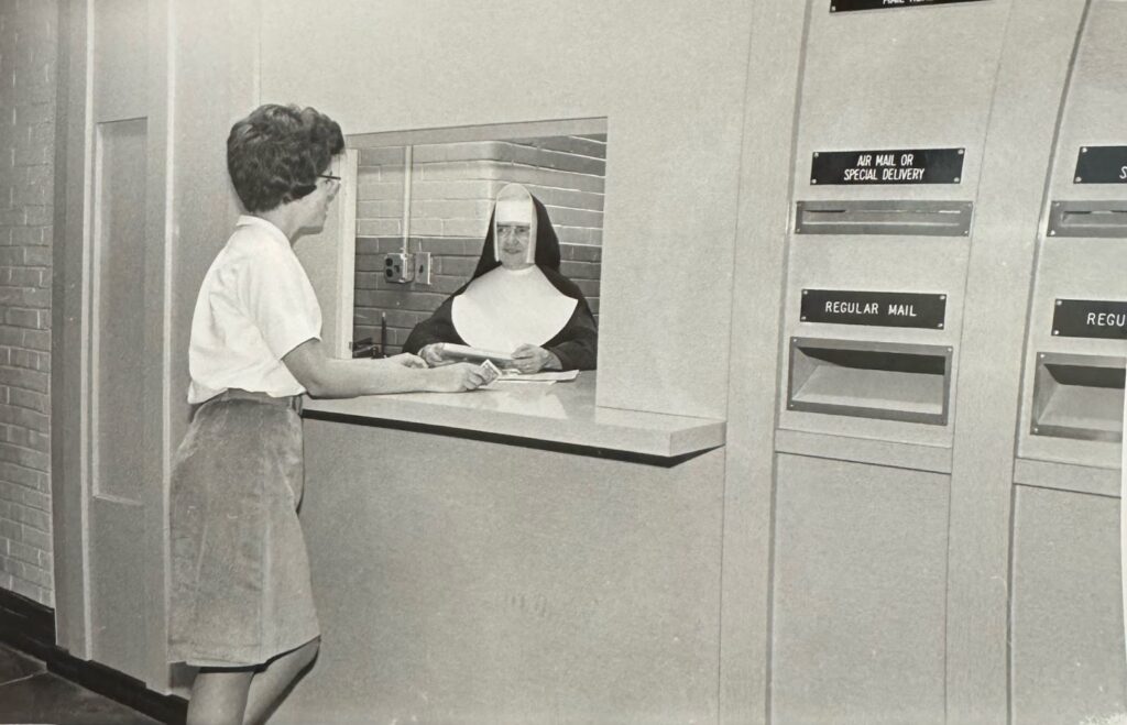 One of the most distinctive features in the university’s history was its United States Post Office on campus. The post office was located in Nazareth Hall on the terrace level. Because the post office was on campus, Immaculata had its zip code, 19345. The post office was run by a sister who served as the postmaster for several years.